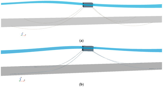 Currently, numerous numerical simulations explore the interaction between waves and structures [22,23,24], yet relatively few studies focus on the response of floating bodies and mooring systems under viscous flow conditions. Domínguez J M [25] investigated the mooring tension and dynamic response of mooring pontoons based on the coupling of DualSPHysics and MoorDyn (Lumped-Mass Mooring Dynamics). Chen H [26] utilized OpenFOAM® and MoorDyn coupling to study the changes of wave height, floating body motion, and mooring tension. However, the accuracy of the traditional SPH method in simulating the free surface boundary is low, and the motion state of the fluid cannot be well simulated. When OpenFOAM® simulates the motion of a floating body, it generally uses two methods: overlapping grid [27,28] and dynamic grid [29,30]. The computational efficiency of the overlapping grid is slow, and the dynamic grid cannot calculate the large deformation motion of the object. In STAR-CCM+, the catenary model for mooring systems allows for the setting of parameters such as unit mass, length, and stiffness. This approach can accommodate taut mooring simulations; however, when the length of the catenary is sufficiently long to reach the bottom of the flume, the system may penetrate the flume model, as shown in Figure 1a, preventing accurate simulation of the mooring line touching the bottom and thus affecting the precision of numerical results. The application of DEM to simulate mooring system can directly solve and configure the detailed parameters of mooring, such as Young ’s modulus, diameter, stiffness, density, and length. It can not only avoid the problem of mooring penetration at the bottom, as shown in Figure 1, but also consider some special problems, such as local problems that cannot be considered by the lumped-mass method [31].