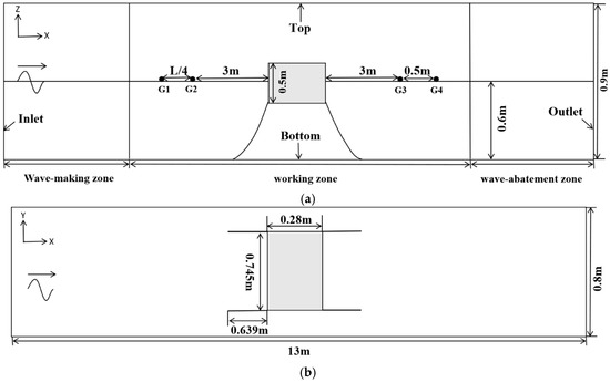 Numerical wave flume arrangement: (a) side view, (b) vertical view.