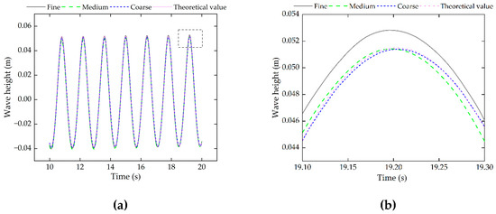 To verify the accuracy of wave making in the numerical flume, a grid convergence analysis is first conducted, using three grid types (coarse, medium, and fine) to compare the simulation results. The detailed grid parameters are provided in Table 1.