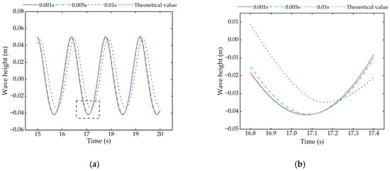 In this study, a second-order time discretization scheme is used. Since the time step significantly impacts both the accuracy of the results and the convergence of residuals, it is necessary to verify its convergence. The numerical results for three different time steps—0.001 s, 0.005 s, and 0.01 s—are compared. Figure 4 shows the free surface duration curve of the wave altimeter at x = 0 with the selected grid. As seen in Figure 4, the wave phase difference between 0.01 s and 0.005 s is 0.1 s, and between 0.005 s and 0.001 s, it is 0.002 m. Considering both calculation efficiency and accuracy, a time step of 0.005 s has been selected.