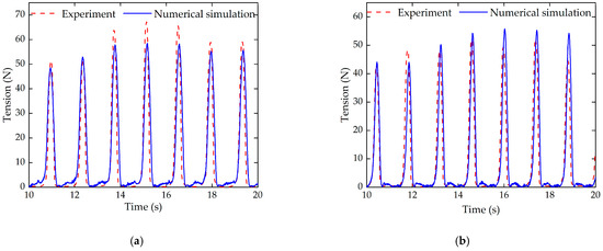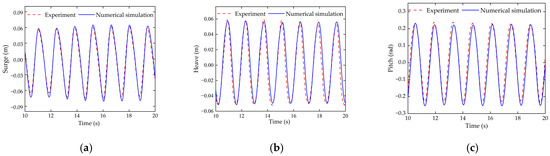 Figure 5 shows the time-history curves of mooring tension. As the waves propagate, the mooring tension on both the seaward and leeward sides exhibits periodic variations, which are in good agreement with the experimental results. The maximum error for the wave-facing side is 10.7%, with an average error of 8.2%. For the leeward side, the maximum error is 11.2%, and the average error is 6.8%. The differences between the numerical simulations and experimental results are mainly caused by wave elimination conditions in the numerical model, which result in the reduction of the positive effect of boundary-reflected waves on the seaward side and the negative effect on the leeward side. As a result, a smaller mooring tension on the seaward side and larger forces on the leeward side are observed, compared to the experimental data.