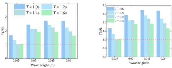 Figure 8 shows the variation of the amplitude of the mooring force on both the seaward and leeward sides of the floating body unit with the wave height. As shown in Figure 8a, the mooring tension on the seaward side increases with both wave height and period. From Figure 8a, it is observed that the mooring tension on the seaward side increases with both wave height and period. Figure 9 presents the ratio of mooring tension on the seaward side to that on the leeward side at different wave heights. It also illustrates how this ratio changes with the wave period for a given wave height. It is evident that this ratio is greater than 1 across all wave heights. At a constant wave height, the ratio of tension decreases with increasing period. For instance, at H = 0.045 m, the maximum ratio YL/BL is 2.73, while the minimum YL/BL is 1.93. The primary reason for this behavior lies in the varying wave penetration capabilities associated with different wave periods. At the same water depth and wave height, shorter wave periods correspond to shorter wavelengths and poorer penetration capability, leading to higher relative energy dissipation as waves pass through the floating body unit. Consequently, the leeward line tension becomes significantly smaller than the seaward line tension under short periods. As the wave period increases, the wavelength lengthens, improving penetration capability, and reducing the relative energy dissipation. This results in a decrease in the YL/BL ratio. Figure 10 shows the amplitudes of surge, heave, and pitch of the floating body unit under different wave periods and heights. It is evident that as wave height and period increase, the amplitudes of all three motions also increase. According to Figure 10, the mooring tension of the floating body unit is primarily influenced by wave height. Surge is affected by both wave height and period, with wave height having a more significant impact. Heave is predominantly influenced by wave height, with minimal impact from wave period. Pitch, on the other hand, is influenced by both wave height and period, with each factor having a relatively balanced effect.