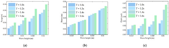 Influence of wave height on the amplitude of three-degree-of-freedom motion of floating body unit: (a) surge, (b) heave, (c) pitch.