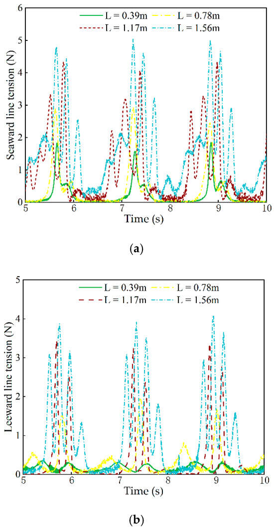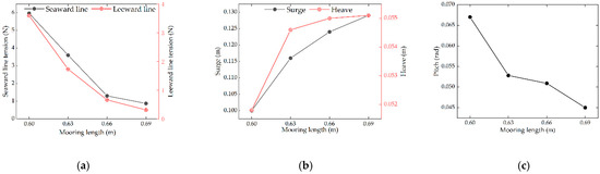 Figure 11a illustrates the effect of mooring length on the mooring tension on both the seaward and leeward sides of the floating body unit. The results show that as the mooring length increases, both the seaward and leeward mooring tensions gradually decrease and stabilize. This behavior can be attributed to the increased contact area between the mooring line and the bottom of the flume as the mooring length increases. A longer mooring line generates pressure and friction at the flume bottom due to its self-weight, which reduces the mooring tension. Furthermore, as the mooring line length increases, the effective length of the mooring line acting on the floating body unit becomes shorter. When the mooring line reaches 0.66 m, it approaches the vertical distance between the floating body unit and the flume bottom. Beyond this point, further increases in mooring length result in diminishing changes in mooring tension. Figure 11b,c illustrate the impact of mooring line length on the amplitudes of surge, heave, and pitch of the floating body unit. It is evident that as the mooring line length increases, the surge amplitude decreases, while the amplitudes of heave and pitch increase. Surge is primarily influenced by wave forces and horizontal mooring tension. Under constant wave conditions, a longer mooring line forms a larger angle with the horizontal direction at the connection point to the floating body unit, leading to reduced horizontal forces and a decrease in surge amplitude. As the mooring line length increases, larger bending and natural sagging regions develop in the water, resulting in higher vertical forces acting on the floating body unit. This causes a reduction in pitch amplitude and an increase in heave amplitude. However, once the length of the mooring line acting on the floating body unit stabilizes, the angle approaches approximately 90°, resulting in diminishing changes to the heave amplitude.