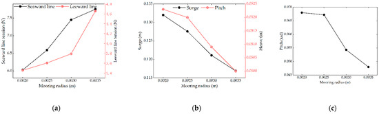 Influence of mooring tension, surge, heave, and pitch motion amplitude of mooring line radius floating body unit: (a) mooring tension, (b) surge and heave, (c) pitch.