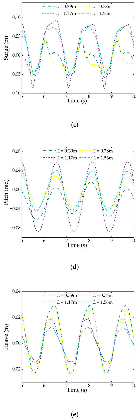 From Figure 14a, it is evident that as the plate length increases, the mooring force on the wave-facing side gradually rises. For L = 0.39 m, the secondary peak of the mooring force is relatively small. When L = 0.78 m, the main peak increases significantly, and the secondary peak becomes more pronounced. At L = 1.17 m, the force exhibits four peaks within one cycle, with the peak values increasing initially and then decreasing. For L = 1.56 m, the cycle further develops six peaks, following the same trend of initial increase and subsequent decrease in peak values. Figure 14b shows that with increasing plate length, the anchor chain force on the back-wave side follows a similar trend to that on the wave-facing side. For L = 0.39 m, there are two small peaks. When L = 0.78 m, the main peak grows substantially, while the secondary peak shows a moderate increase. For L = 1.17 m, both the main and secondary peaks increase significantly. When L = 1.56 m, the force cycle presents four distinct peaks. Figure 14c shows that, for lengths between 0.39 m and 0.78 m, the surge motion amplitude decreases, and the secondary peak value diminishes. However, between lengths of 0.78 m and 1.17 m, the surge motion amplitude increases by an average of 113%, with a pronounced growth rate. The secondary peak disappears, and the primary peak becomes smoother. Figure 14d reveals that, as the length of the floating body unit increases, the pitch amplitude first increases and then decreases. The largest pitch amplitude occurs when the length reaches 1.17 m. Figure 14e shows that the heave motion amplitude decreases gradually with increasing length. A secondary peak appears when the length is 0.78 m, and this secondary peak gradually diminishes as the length further increases.