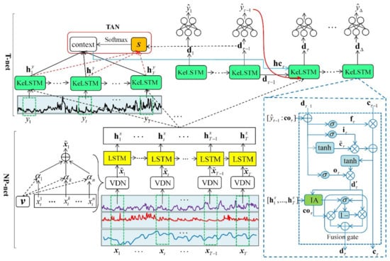 While NP-net is effective in mitigating the adverse effects of non-predictive variables, it fails to account for the target variable. To address this, we designed an attention-based encoder–decoder network called T-net, which focuses on the target variable series. Specifically, we meticulously crafted a knowledge-enhanced LSTM (KeLSTM) network that incorporates an interactive attention mechanism and introduces a fusion gate unit. The KeLSTM serves as both the encoder and decoder for T-net. Additionally, we introduced a temporal attention network (TAN) to serve as a bridge between the encoder and decoder of T-net, facilitating the selection of the most relevant items from the encoder for prediction.
