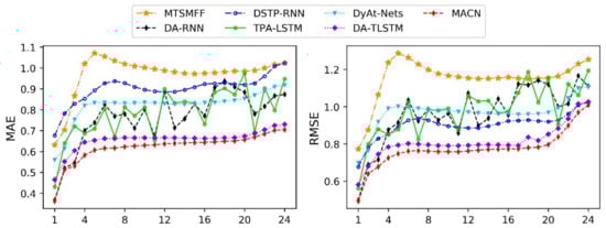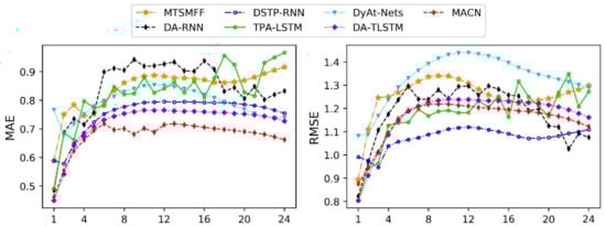 Furthermore, utilizing the application scenario where as an example, this work visualizes the aforementioned method to evaluate and compare the performance of the MACN against the baseline method across various prediction points, as illustrated in Figure 3 and Figure 4. In these figures, the x-axis values correspond to different prediction points within a specified prediction horizon, while the y-axis values represent the Mean Absolute Error (MAE) or Root Mean Square Error (RMSE) achieved by the different methods at those specific prediction points. For example, at a point where the x-axis value is 1, the red curve in Figure 3 indicates the predictive capability of the MACN at the initial position in the model’s output sequence, assuming a sequence length of 24. Intuitively, when compared with other deep learning-based baseline methods such as MTSMFF, DA-RNN, DSTP-RNN, TPA-LSTM, DyAt-Nets, and DA-TLSTM, the MACN presented in this paper demonstrates an advantage in the practical application of chlorophyll concentration prediction. Upon analyzing the structure of each model, it is evident that the MACN outperforms the other methods due to the following reasons: (i) In contrast to modeling methods that handle all input variables in a unified manner, the MACN’s strategy of modeling chlorophyll and non-predictive sequences separately allows for better capturing the interactions between them and more accurate representations of real future scenarios. (ii) The variable-distillation attention network effectively mitigates the negative effects of non-predictive variables. (iii) KeLSTM in T-net successfully captures the potential interactions between past chlorophyll sequences, non-predicted sequences, and upcoming predictions. In particular, it identifies subtle differences between these two potential interactions, specifically the out-of-sync phenomenon regarding their temporal correlation with the prediction task.