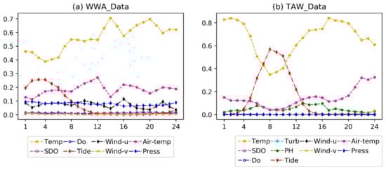 In Figure 5, we showcase the visualization of the weight distribution associated with the VD utilizing both the WWA-Data and TAW-Data datasets. The x-axis depicts various time steps, and the y-axis indicates the weights assigned to different variables at those specific time steps. Variables that exhibit higher weight values signify a more significant influence on the predictions made by the MACN. It is evident that the influence of variables on prediction tasks fluctuates over time. The MACN not only distinguishes between the predictive importance of each variable but also captures dynamic shifts in this importance. As illustrated in Figure 5, for both the WWA-Data and TAW-Data, the VD assigns relatively higher weights to seawater temperature (Temp), air temperature (Air-Temp), and tide (Tide), which is consistent with the findings reported in [29,30]. Consequently, the explanatory information provided by the MACN for prediction tasks is deemed reliable. Furthermore, Figure 5 reveals an additional insight: different combinations of variables result in variations in their contributions to the prediction task. For instance, in the WWA-Data, barometric pressure (Press) plays a significant role in predicting chlorophyll concentration. However, when the PH and Turb variables are incorporated into the TAW-Data, barometric pressure exhibits a weaker correlation with the prediction of chlorophyll concentration. This underscores the MACN’s capability to select the variables that are most pertinent to the task based on the inherent characteristics of the data.