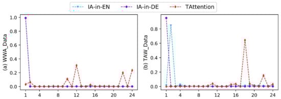 As shown in Figure 6, the curves labeled ‘IA-in-EN’ and ‘IA-in-DE’ exhibit slight variations but follow similar trends, confirming the effectiveness and stability of information attention. Additionally, the visualization results indicate that the volatility of the “TAttention” curve differs from that of the “IA in DE” curve. This observation implies that T-net effectively captured the nutritional distinctions within the temporal correlations. However, considering the predictive performance summarized in Table 3 and Table 4, these experiments underestimate the significance of independently modeling targets and non-predictive series.