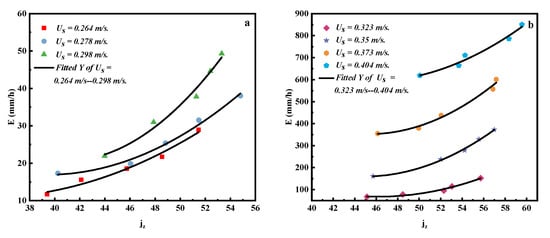 Figure 10 and the fitted equations, the fitted curves with velocities of 0.044 m/s–0.048 m/s in a period of 2 s are convex functions, while those with velocities of 0.046 m/s–0.049 m/s in a period of 2.5 s are convex functions. This means that although the erosion rate increases with the seepage gradient, this effect has a decreasing trend. Furthermore, the oscillatory flow rates of these functions are all within 0.050 m/s. At this time, the velocity is small, the surface of the soil sample is in the slow-start state, even though the pressure is applied to the bottom of the soil sample; in addition, the velocity at this time can only remove the smaller particles and the larger particles cannot still be shaken. This may be due to the fact that for the early erosion of the soil surface, the magnitude of the velocity has the main influence, while the change in the seepage gradient plays only an auxiliary role.