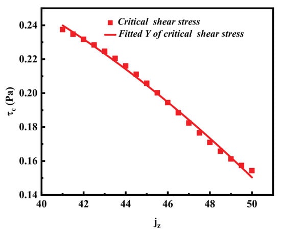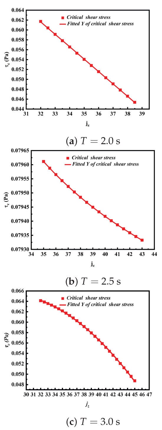 Figure 11 represents the relationship between the seepage gradient and the critical shear stress for periods of 2 s, 2.5 s, and 3 s, respectively. A quadratic fit was made to the data and the following equations were obtained: