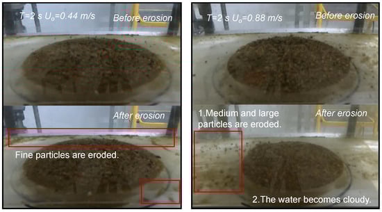 Figure 9). At lower velocities, the finer particles of the surface sediment exhibit slight wobbling and creeping. Over time, larger particles begin to show slight movement. As velocity increases, more sediments become involved in a rocking motion, including particles of the median grain size. At weak points, small groups of sediment can roll up and detach from the soil. When the velocity reaches a certain threshold, large particles also begin to sway and a large amount of sediment on the surface participate in the movement. Under the continuous action of oscillatory flows, some of the sediment is suspended in the upper water body, causing turbidity and leading to complete erosion of a sediment layer on the surface of the soil body.