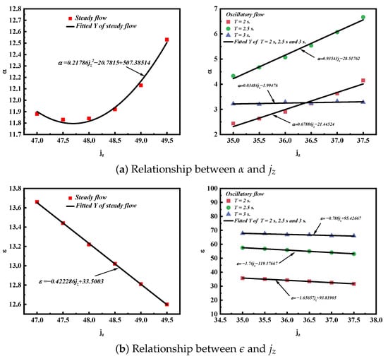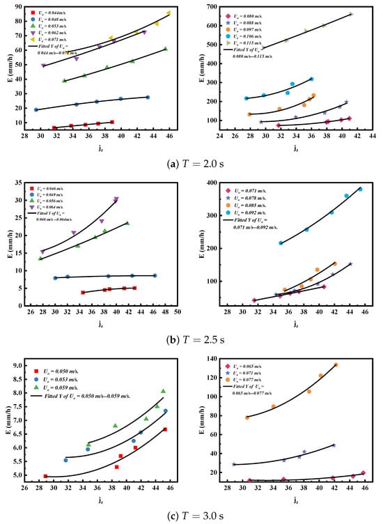 Figure 10a–c for velocities of 0.044–0.115 m/s, 0.046–0.092 m/s, and 0.050–0.077 m/s, respectively. The gap in the number of experimental groups is due to the fact that the velocity required for erosion to occur in the surface soil samples is not the same at different periods, and the larger the period, the larger the required velocity. The relationship between the seepage gradient and the erosion rate under oscillatory flow can be fitted by (3), and the coefficients (