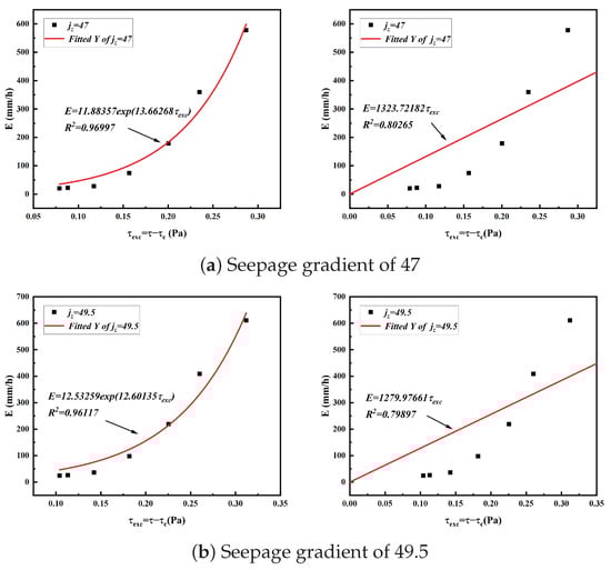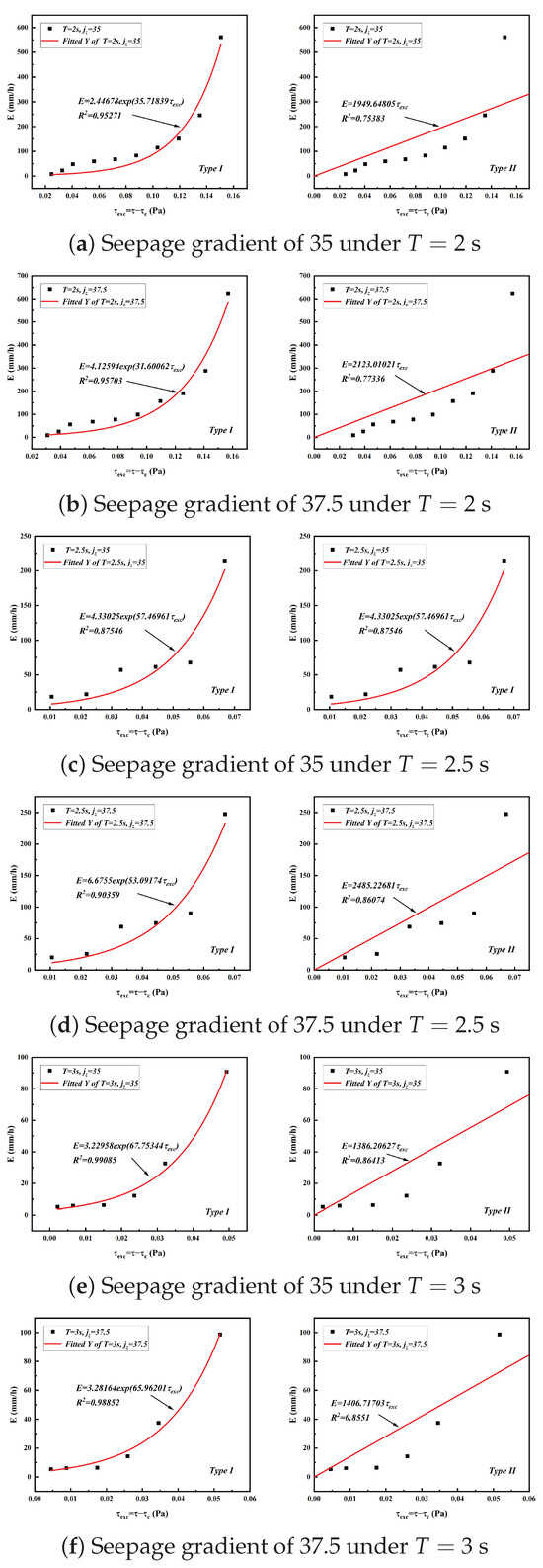 Based on the discussion above, the experimental data were further analysed using the type I erosion equation. Based on a series of relationships between the erosion rate (E) and the corresponding critical shear stress () for various seepage gradient (), the erosion coefficients ( and ) for each round were obtained by exponential regression. Then, a parametric equation between the seepage gradient and the erosion coefficient could be established.