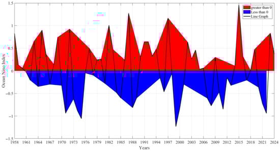 The zonal extent of the study area ranged from 3° N to 23° N, and the longitudinal extent was from 99° E to 123° E (Figure 1). To precisely identify El Niño and La Niña events, the Ocean Niño Index (ONI) of the National Oceanic and Atmospheric Administration (NOAA) was utilized, and an ONI map was generated (Figure 2). The ONI represents the three-month rolling average of the sea surface temperature (SST) in the Niño 3.4 region (5°N–5° S, 170°–120° W). In accordance with the Climate Prediction Center of NOAA, El Niño and La Niña events are classified when five consecutive ONI values exceed +0.5 °C (El Niño) or fall below −0.5 °C (La Niña), respectively. Additionally, for at least three overlapping three-month periods, events with ONI values within these thresholds are categorized as moderate, strong, or very strong El Niño events, following the same criteria as those for classifying weak, moderate, strong, and very strong El Niño events [20].