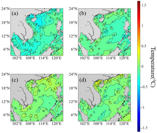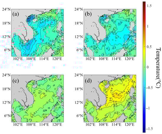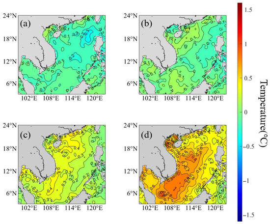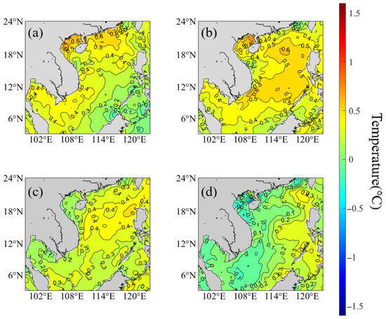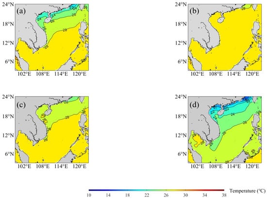 The SST distribution in the South China Sea has an obvious spatial pattern, showing an obvious gradient from north to south. South of 17° N, the isotherms run along a northeastern–southwest direction, while north of 17° N, the isotherms run along an east–west direction. This results in a significant temperature difference between the North and South regions, especially in spring and winter when this contrast is most pronounced. In summer, the whole South China Sea SST increased significantly, and the temperature was between 28 and 30 °C (Figure 3). A notable exception, however, is the low-temperature region off the east coast of Vietnam, where the SST can drop to around 28 °C due to factors such as updrafts, the Vietnam Cold Vortex effect, and the cold filament phenomenon caused by the easterly jet stream near the sea [21].