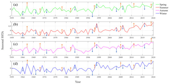 The seasonal mean SSTAs in the South China Sea during 1958–2021 in (a) spring, (b) summer, (c) autumn, and (d) winter (the upward orange arrow represents a strong El Niño event, and the downward blue arrow represents a strong La Niña event).