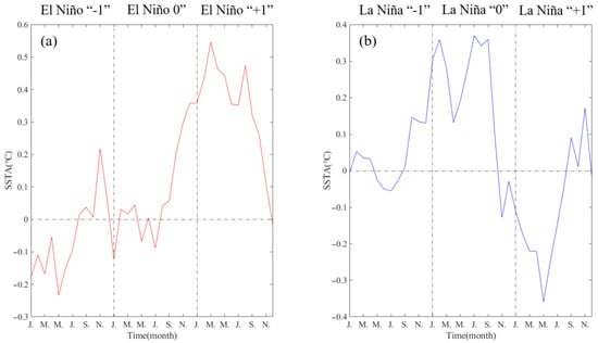 SST of the “−1 year” to “+1 year” periods of El Niño events and La Niña events during 1958–2021 (where (a) is El Niño events and (b) is La Niña events; among them, J., M., M., J., S., and N. represent January, March, May, July, September, and November, respectively, and then the cycle repeats).