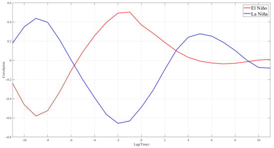 The correlation lag of SSTAs in the South China Sea with El Niño events and La Niña events.
