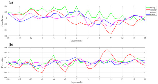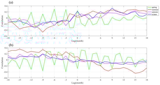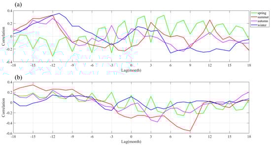 In the La Niña “+1” year (Figure 15b), in spring (green line), the correlation coefficient shows periodic changes without an obvious maximum value because the ocean–atmosphere system is in adjustment. In summer (red line), the correlation coefficient is −0.55 at a lag of 9 months, and the influence of the atmospheric circulation and ocean processes is significant. In autumn (pink line), the correlation coefficient is −0.38 at a lag of 4 months, which is related to the air–sea interaction. In winter (blue line), the correlation coefficient is −0.16 at a lead of 3 months, and the previous influence is manifested at this time.