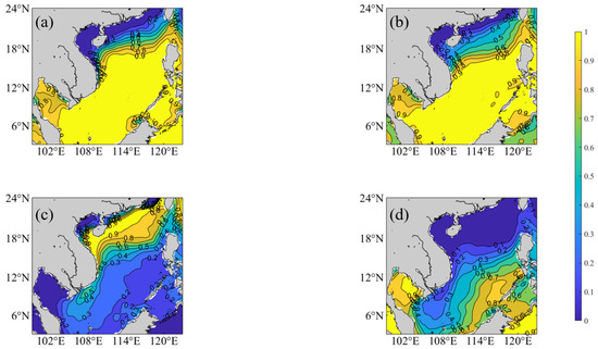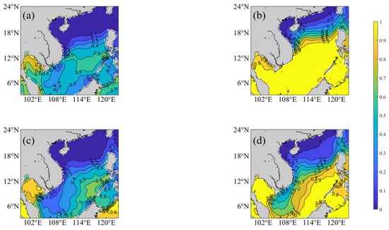 Through verification, in El Niño and La Niña events, SSTAs and ONIs show a strong correlation in both summer and winter. In El Niño events, there is a strong correlation three months ahead in summer and a strong correlation one month behind in winter. In La Niña events, the summer lag of 8 months shows a strong correlation, and the winter lag of 9 months shows a strong correlation. This difference in seasonal correlation might be attributed to a slight deviation in the timing of El Niño events between June and September, while most La Niña events occur between October and February [28]. We can also find that the correlation of the four seasons in the southern part of the study area is stronger than that in the northern part. Then, what are the factors contributing to the response of the South China Sea to the events of El Niño and La Niña?