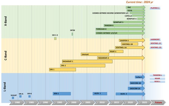 In this section, we summarize the main characteristics of SAR data used for our experiments and acquired by the ENVISAT ASAR sensor (which has been primarily exploited for marine applications), as well as by the newly launched ICEYE constellation. The interest in the proposed comparison analysis resides in the growing availability of a wide range of spaceborne-based SAR missions operating at different microwave frequencies [2]. Figure 1 shows a diagram that pictorially describes SAR systems’ development over time, grouped for operative bands (e.g., X-band, C-band, and L-band). The following subsections describe the main characteristics and the acquisition modes of the specific SAR data exploited for the experiments presented in Section 4.