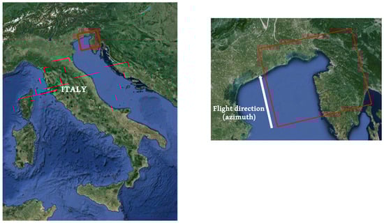 In our research, we profit from the main outcomes of a previous study [41,49], describing the most impressive results obtained by applying the DCA methodology to ASAR data related to the coastal area of the northern Adriatic Sea (Northeast Italy), collected on Ascending (track 358) and Descending (track 351) orbits. Unlike [41,49], in this work, we use one single ENVISAT ASAR data frame acquired on the Ascending orbit. Figure 2 shows the location of the test-site area. Specifically, the red rectangle highlights the swath of the ASAR frame used for the experiments shown in this study.