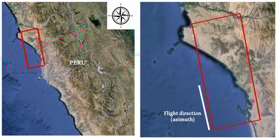 The experiments carried out in our research with ICEYE data refer to a region over the Perù coastal area (South America) north of Lima, which is shown in Figure 3. In particular, the used SAR image was collected in Stripmap mode on 26 January 2022 through an Ascending orbit. The SAR image covers a coastal area of about 50 km × 30 km (azimuth × range).