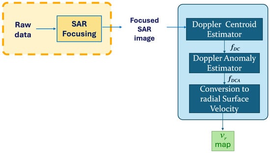 Conversely, the DCA technique [16] relies on the analysis of the Doppler Centroid Anomaly, i.e., the anomaly that accounts for the motion of surface roughness elements on the ocean surface corrected for the Earth’s rotation, allowing one to derive the estimates of the surface current velocity. Indeed, DCA computes the differences between the Doppler Centroid (DC) estimated from the SAR data and the frequencies predicted from the relative motion between the satellite and the Earth’s rotation, which reflect the geophysical information about the motion of the marine surface. Alternatively, the Doppler frequencies can be estimated using time- and frequency-domain algorithms.