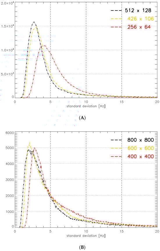 Figure 5 shows the histograms of the estimated DC STD for ENVISAT ASAR (Figure 5A) and ICEYE (Figure 5B) data considering the three windows reported in Table 4. Of note, for each dataset, the theoretical STD (according to Equation (1)) decreases as the size of the aforementioned DC estimation windows increases. This is evidenced by the fact that the histogram peaks shift towards the left as the estimation window size increases.