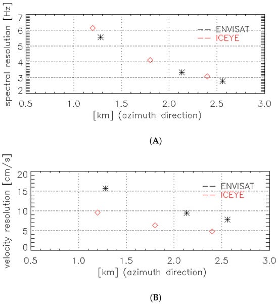 (A) SR and (B) VR of ENVISAT and ICEYE data at the different azimuth window sizes on the ground.