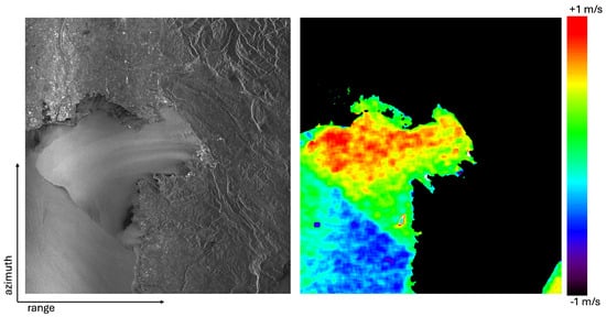 Figure 7 (on left) shows the SAR amplitude image relevant to the ASAR acquisition collected on 16 January 2009 over the Trieste gulf. This area has a distinctive and persistent wind, “named Bora”, which originates from the mountains on the eastern side of the Adriatic Sea [41]. This specific wind phenomenon can result in significant surface currents as evidenced by the amplitude of the focused SAR images on the left of Figure 7. On the right side of Figure 7, the estimated radial surface velocity () is shown. The DCA is estimated on the SAR image over a sliding tile of 512 (azimuth) by 128 (range) pixels. This corresponds to a square patch on the sea surface of edge km, a spectral resolution of Hz, and a velocity resolution of almost 8 cm/s. The front of the surface current generated by the Bora wind is recognizable. The estimated radial component of the sea surface velocity is within the range of m/s; the direction of the sea surface velocity is orthogonal to the flight direction. The red and blue colors (redshift and blueshift) of the estimated sea surface velocity component indicate a motion towards and away from the radar antenna, respectively [41,49].
