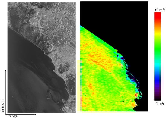 Since, as already stated in Section 2.2, for ICEYE only, Level-1A and Level-1B products are available, the DCA analysis starts from focused SAR data. Following the steps outlined in the block diagram of Figure 4, a map of surface radial marine velocity is generated according to the DCA methodology. It is shown (see the right of Figure 8) that varies in the range of m/s.