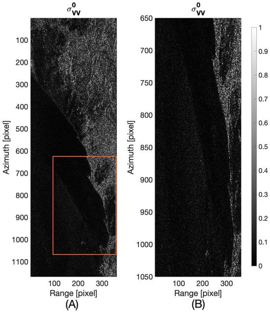 Microwave remote sensing methodologies, based on the use of Synthetic Aperture Radar (SAR) sensors, have been extensively developed for a variety of land surface monitoring applications [2]. In recent decades, the scientific community has shown a growing interest in the study of marine parameters through the use of SAR, which generally complements traditional remote sensing techniques based on optical or multispectral sensors. Among various remote sensing techniques employed to detect and monitor marine environments [1,3,4,5,6], Synthetic Aperture Radar (SAR) technology has progressively become a well-established practice. Differently from optical sensors, SAR allows obtaining all-weather and day–night imaging of wide areas of Earth’s surface [7]. SAR remote sensing for ocean, sea, and coastal applications mostly exploits the amplitude of the backscattered signal, for example, monitoring oil spills [8] and sea ice [9], ship detection [10], and high-resolution wind fields retrieval [11].