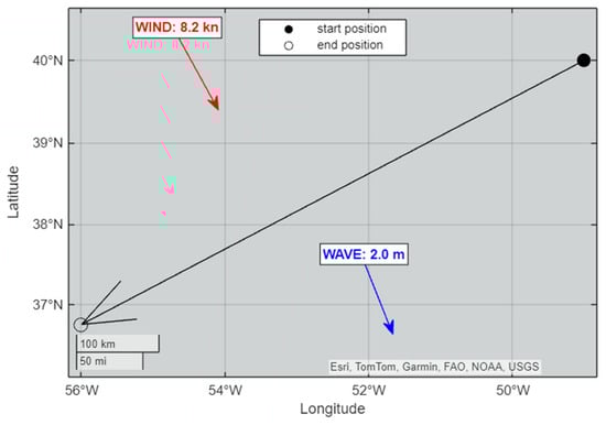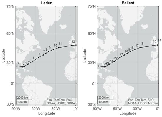 The selected route for the case study is a common route from Corpus Christi (USA) to Rotterdam (Figure 2). The weather characteristics per leg were provided by the ORCELLE partner StormGEO, Bergen, Norway [] and contain ERA5 data from 2022. ERA5 [] is the fifth-generation atmospheric reanalysis of the global climate, produced by the Copernicus Climate Change Service (C3S) at ECMWF. Seasonal changes in weather are taken into consideration by simulating multiple scenarios within 2022. More specifically, instead of simulating the voyage for the average weather conditions that prevail in each waypoint, 24 actual weather scenarios are simulated for the same route by assuming different start dates of the voyage. This results in an average year-round fuel consumption estimation which provides a more realistic picture of the expected fuel consumption based on actual weather conditions and not on average values.