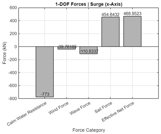 In this case study, certain assumptions about the placement and interaction of the wing sails are made to simplify the problem, reduce computational time, and limit the number of variables in the optimization process. The positioning of the sails (both longitudinally and laterally) plays a critical role in maximizing their effectiveness. However, within the 1-DOF model, the exact placement of the sails is not analyzed. Instead, it is assumed that an optimized sail arrangement exists, which maximizes wind-generated thrust, minimizes the impact of drift angle and rudder resistance needed to maintain course, and meets all necessary requirements (e.g., bridge visibility, structural integrity, etc.) [].