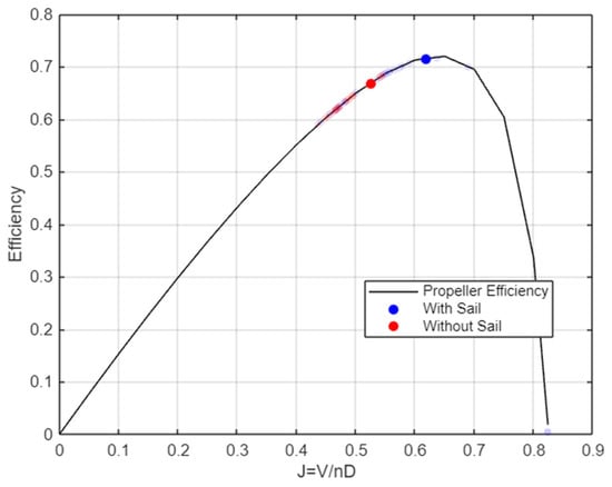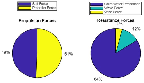 When the force generated by the sails is sufficient to propel the vessel at the desired speed (i.e., 100% wind-generated thrust), several options for propeller operation are available, such as windmilling, feathering, or energy harvesting []. However, for this optimization problem, energy harvesting from the rotating propeller is not considered, and the additional resistance caused by a windmilling or feathered propeller is also excluded from the analysis.