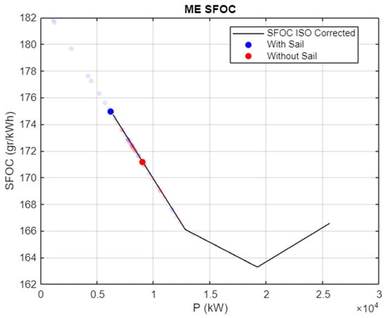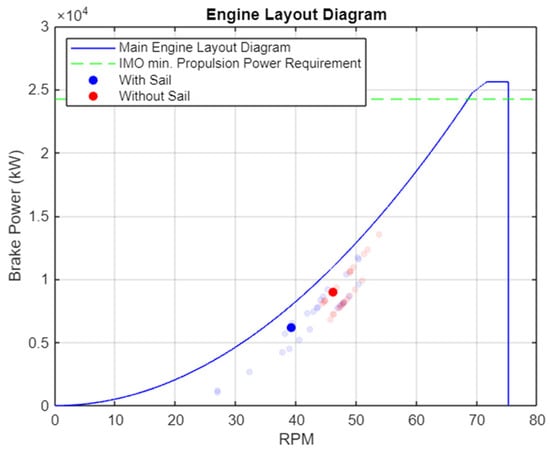 The engine layout diagram and the calculated operational points for all voyage legs are presented in Figure 7, while the Specific Fuel Oil Consumption (SFOC) is shown in Figure 8. It is important to note that the engine is assumed to remain in operation at all times (i.e., zero brake power is not permitted). In practice, very low engine loads [] need to be addressed through an operational strategy, such as increasing vessel speed or adjusting sail trim, to avoid operating at such low loads with correspondingly high SFOC. However, in the optimization conducted for this study, this factor was not considered, as most operational points in the examined case study do not require extremely low engine loads. As a result, the influence of such operational strategies on the optimization results is minimal.