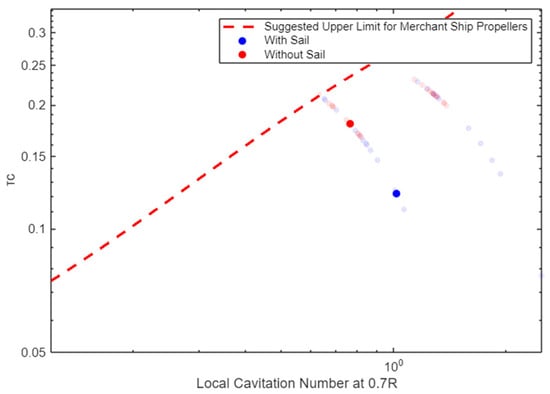 The study vessel is herein assumed to be equipped with a Fixed Pitch Propeller (FPP), even though in practice, WAPS ships will be generally equipped with Controllable Pitch Propellers (CPPs), better accounting for the varying effect of WAPSs on propeller and engine loading. In this study, the fitted FPP is modeled using the polynomials of the Wageningen B-series [,]. Propeller efficiency is calculated for various operating points (Figure 9), and a verification is performed to ensure that excessive cavitation does not occur (Figure 10).