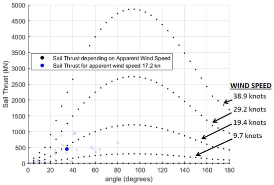 Wing sail thrust (8 wing sails) depending on wind angle and wind speed.