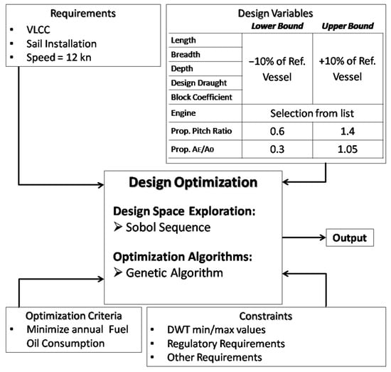 Following this reasoning and for the purpose of optimizing the ship’s concept design, a one-degree-of-freedom (1-DOF), quasi-steady model has been developed and coded for simulating and optimizing a ship operating in a predefined route with available weather data information. The developed model takes into account the interaction between the hull, propeller, engine, and sail, simulates and balances all forces in the surge direction, and estimates the power and fuel consumption needed to complete a scheduled voyage (Figure 1). In addition, the developed model allows communication (exchange of data) between MATLAB and the more advanced NAPA (version 2021.2-1) naval architectural software package []. This enables the conduct of a more detailed analysis for each generated design alternative, which includes lightship and loading condition determination, intact stability criteria assessment, environmental regulation assessment (e.g., oil outflow compliance for tankers), and overall performance analysis. The user can choose when NAPA should be utilized during the optimization. Alternatively, simplified calculations can be conducted within MATLAB without the need to use NAPA, which may provide fewer details but it significantly speeds up the optimization procedure. Indicatively, when using NAPA, a single simulation takes approximately 40 s, whereas computations using semi-empirical formulas within MATLAB take approximately 1 s on a conventional computer. The results presented in this study were conducted using only MATLAB internal routines.