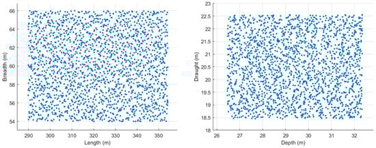 The design optimization problem incorporates 15 constraints to ensure that the resulting designs are feasible. Specifically, these constraints include limits for the Deadweight Tonnage (DWT), form coefficients, and main dimension ratios to ensure that the generated designs are practical and closely aligned with data from existing vessels []. The constraints also ensure that the propeller operates within engine limits while minimizing cavitation [], and that the designs comply with regulations regarding freeboard [] and minimum propulsion power []. A minimum metacentric height (GM) of 3 m is required as an initial control check for the vessel’s intact stability.