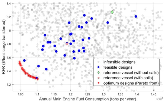 The optimization algorithm results are shown in Table 2, while Figure 15 provides a comparison of the initial population (both feasible and infeasible), the reference vessel (with and without sails), and the optimized vessels.