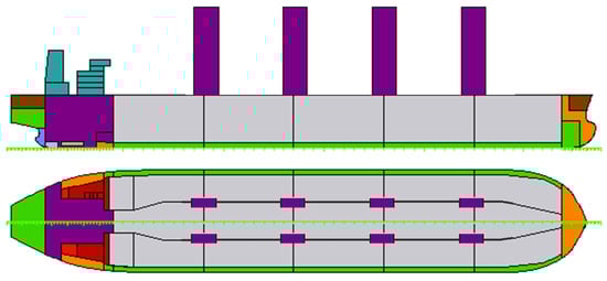 Figure 15 illustrates that during the design exploration phase, a considerable number of infeasible designs (represented by gray points) were generated, highlighting the influence of the defined initial design conditions and constraints. The outcome underscores the importance of having a sufficiently large and evenly distributed initial design population to ensure that the optimization algorithm converges to the global optimum. The optimized designs exhibit reduced breadth and greater draught. These design characteristics have a positive effect on the sail thrust-to-resistance ratio []. In addition, the optimized designs show improvements in calm water resistance and hull efficiency coefficient, as well as in the added wave resistance, thus contributing to the overall performance enhancement, even without the incorporation of sails. A detailed analysis of the optimized designs along the Pareto front reveals that larger vessels exhibit improved RFR, while smaller vessels show reductions in fuel consumption, as anticipated. It is worth noting that the ±5% constraint on deadweight DWT relative to the reference vessel allows the displacement to vary accordingly, provided the DWT remains within the prescribed range. It is also interesting to note that if the present wing sail system were installed at the reference vessel (retrofitting), the estimated annual main engine consumption would be 11895 tons (instead of 13,253 tons—appr. 10% improvement). For the RFR, the improvement is 5%. Compared to the original vessel (green point in Figure 15), multi-optimized designs are more than 20% better in terms of fuel consumption (and associated emissions), and likewise in terms of RFR. It should be finally noted that the effect of the WAPS on the ship’s main dimensions can be expected to be more drastic for other ship types and sizes, and thus in general for volume carriers (like car carriers) compared to deadweight carriers (tankers and bulkers); in other words, considering the same wind potential for all ships operating on the same route, its effect on a ship’s propulsion (and motions) will be directly dependent on the ship’s size (and displacement), and thus on the magnitude of the generated wind thrust compared to the ship’s total resistance. A schematic diagram of the wind-assisted VLCC designed in NAPA [] is depicted in Figure 16.