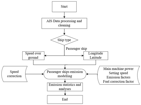 The overall technical workflow of this study is shown in Figure 2. It primarily includes the processing, calculation, and visualisation of the AIS-based ship emission inventory, which consists of five main steps. First, the AIS data underwent pre-processing, including cleaning abnormal information and identifying Maritime Mobile Service Identities (MMSIs) corresponding to passenger ships or high-speed ships, followed by matching the relevant dynamic details. Second, the technical specifications of passenger ships were collected, and corrections to the ship speeds were made based on meteorological factors. Third, the key parameters were determined, including the actual operating speed of the ship, emission factors, main engine load coefficients, as well as the ship’s emission location and time stamps. Fourth, the pollutant emissions from passenger ships’ main engines were calculated to generate an emission inventory. Finally, visualisation software was used to create spatial distribution maps of the pollutant emissions.