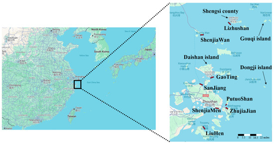 In this study, we focused on the Zhoushan Port area in Zhejiang Province, China, as the research region. The study area extends northward to Huaniao Town in Shengsi County, Zhoushan, eastward to the Dongji Islands, and southward to the Jiushan Archipelago in Xiangshan County, Ningbo. Using AIS data from the entire year of 2020, we calculated and analysed the pollutant emissions of passenger ships throughout this region. Additionally, we examined the temporal and spatial characteristics of passenger ship emissions within the study area. The research area is shown in Figure 3, which highlights several major passenger terminals.