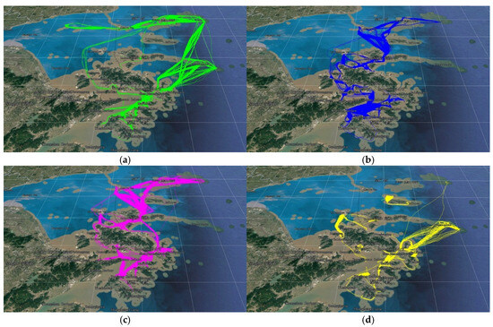 Figure 4 illustrates the trajectory distribution of passenger ships in the Zhoushan area from January to December 2020. The complex trajectory map reflects the frequent movements of ships between the various islands. It can be observed that ordinary passenger ships primarily operated between Zhujiajian Island, Dongji Island, and Shengshan–Gouqi Island on the eastern side, as well as between Shengsi Island and Shenjia Wan. These ships are responsible for transporting passengers over relatively long distances. Ro-Ro passenger ships and high-speed passenger ships mainly navigated between Zhoushan Island, Liuheng, and Daishan. Ferries, on the other hand, were primarily used for short-distance transportation and were seen operating between closely located islands. The most densely trafficked areas were concentrated near Daishan Island, Putuo Island, and Zhoushan Island, where passenger ships frequently entered and left the ports. These locations served as key hubs for docking and transit operations.