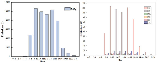 Figure 9 also illustrates the contribution of each ship type to the pollutant emissions. High-speed passenger ships, which made up 31% of all passenger ships, accounted for 41.7% of the total main engine power and only 8.9% of the total tonnage, yet contributed the highest CO2 emissions, amounting to 26,054.1 tons. This was largely due to their frequent activities, including multiple port arrivals and departures. Despite regulatory restrictions on night-time operations for high-speed passenger ships, their emissions remained notably high and warrant further attention. Ro-Ro passenger ships ranked second in emissions. Although their average main engine power is comparable to high-speed ships, they carry significantly more passengers and vehicles. With the largest total tonnage among the ship types, they contributed 38.4% of the CO2 emissions. Ordinary passenger ships, with the highest passenger capacity and being primarily responsible for passenger transport, contributed only about 13.2% of the total CO2 emissions. Car–passenger ferries had the lowest emissions, with a total CO2 output of just 814.2 tons, reflecting their low environmental impact.