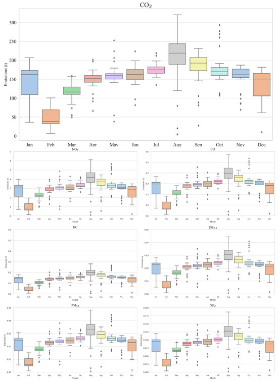 The emissions data for different types of passenger ships are shown in Figure 9. The CO2 emission patterns of the four ship types varied significantly, influenced by the seasonal demand and ship characteristics. Ro-Ro passenger ships exhibited the largest fluctuations in emissions, with their annual emissions ranging from 20 to 100 tons. These ships reach peak emissions during the summer tourism seasons, particularly in August, showing a strong correlation between peak emissions and seasonal demand. Ordinary passenger ships had relatively stable emissions, ranging from 5 to 50 tons. While the emissions increased slightly during summer, the overall fluctuations were minimal, indicating balanced operational characteristics. Car–passenger ferries had the lowest emissions, ranging from approximately 0 to 7 tons. Their seasonal variation was minimal, and the difference between off-season and peak-season emissions was negligible, highlighting their low-emission and steady operational profile. High-speed passenger ships demonstrated significant emission variability, with peaks occurring in January, August, and December, reaching levels of up to 200 tons. This indicates their frequent use during peak passenger periods.
